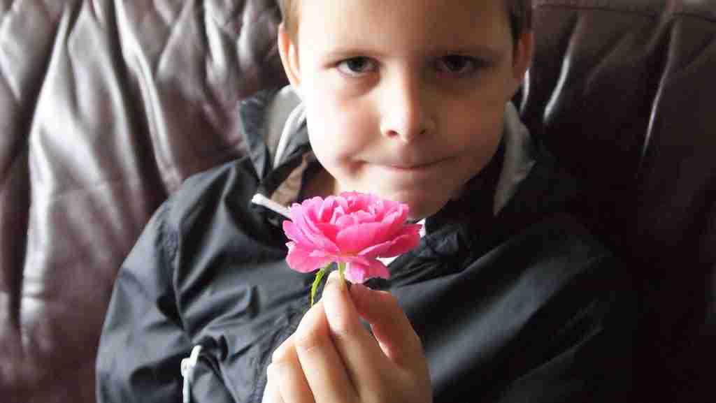 The young lad accidentally pulled up some of the flowers in his handful of weeds in his excitement.